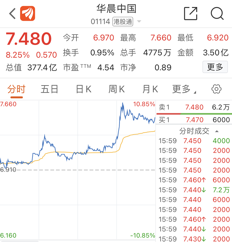 华晨中国短线上扬,盘中涨幅扩大至近10%,截至收盘,股价报收7.48港元,收涨8.25%。A股市场方面,申华控股和金杯汽车涨停。